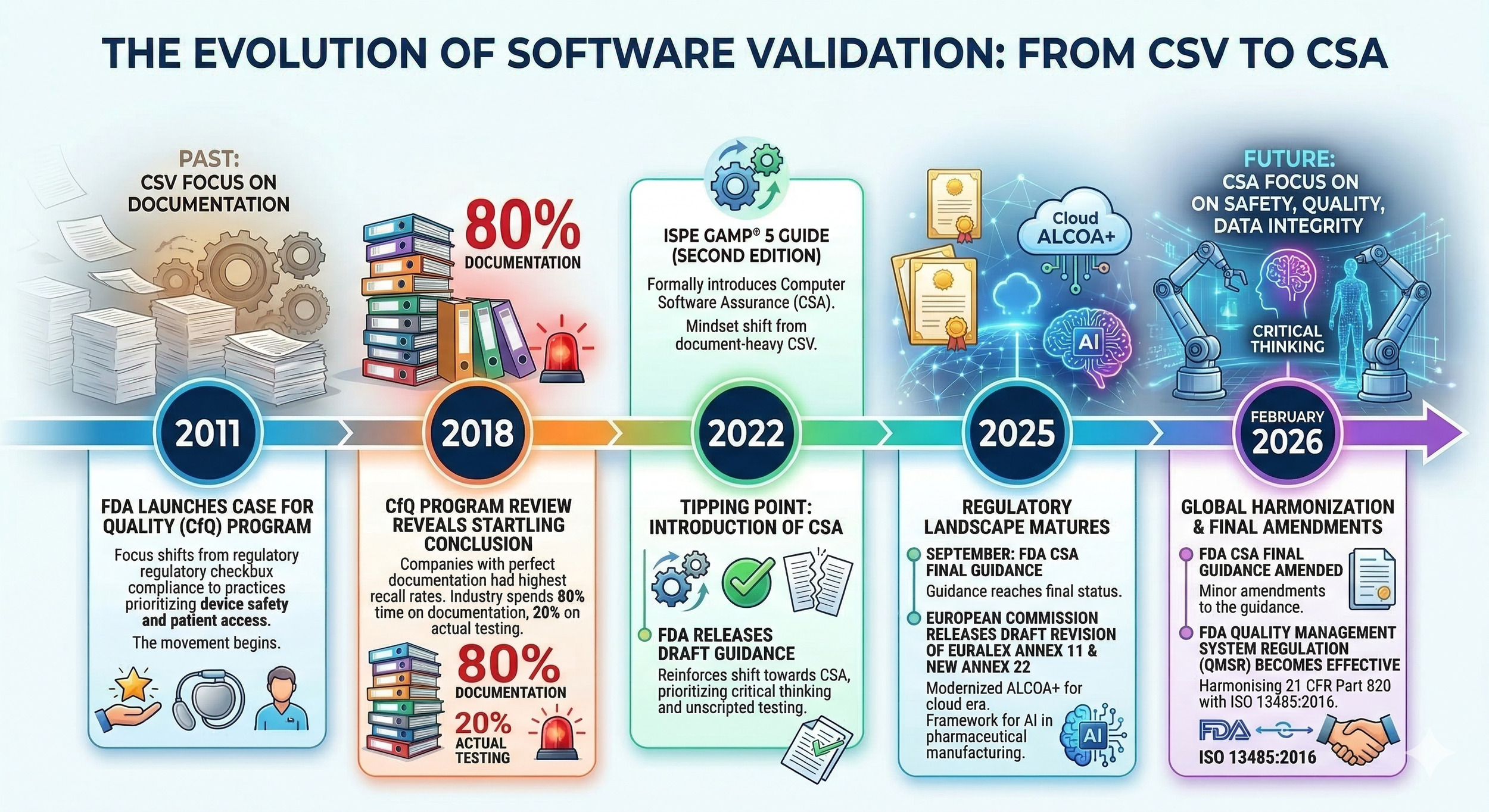 In 2022, the landscape shifted the release of the ISPE GAMP® 5 Guide (Second Edition) [4]. This revision formally introduced Computer Software Assurance (CSA), which had a fundamental mindset shift away from traditional, document-heavy Computerized System Validation (CSV). CSA demands that we stop treating every software feature in an equal manner. It prioritizes critical thinking and unscripted testing over the industry’s previous focus of exhaustive screenshots and mountains of paper records. The FDA solidified this new way of thinking with its Computer Software Assurance for Production and Quality Management System Software guidance [5]. After years of waiting, it reached Final Guidance status in September 2025 and was further refined in February 2026 to reflect the rapid pace of digital adoption [6].