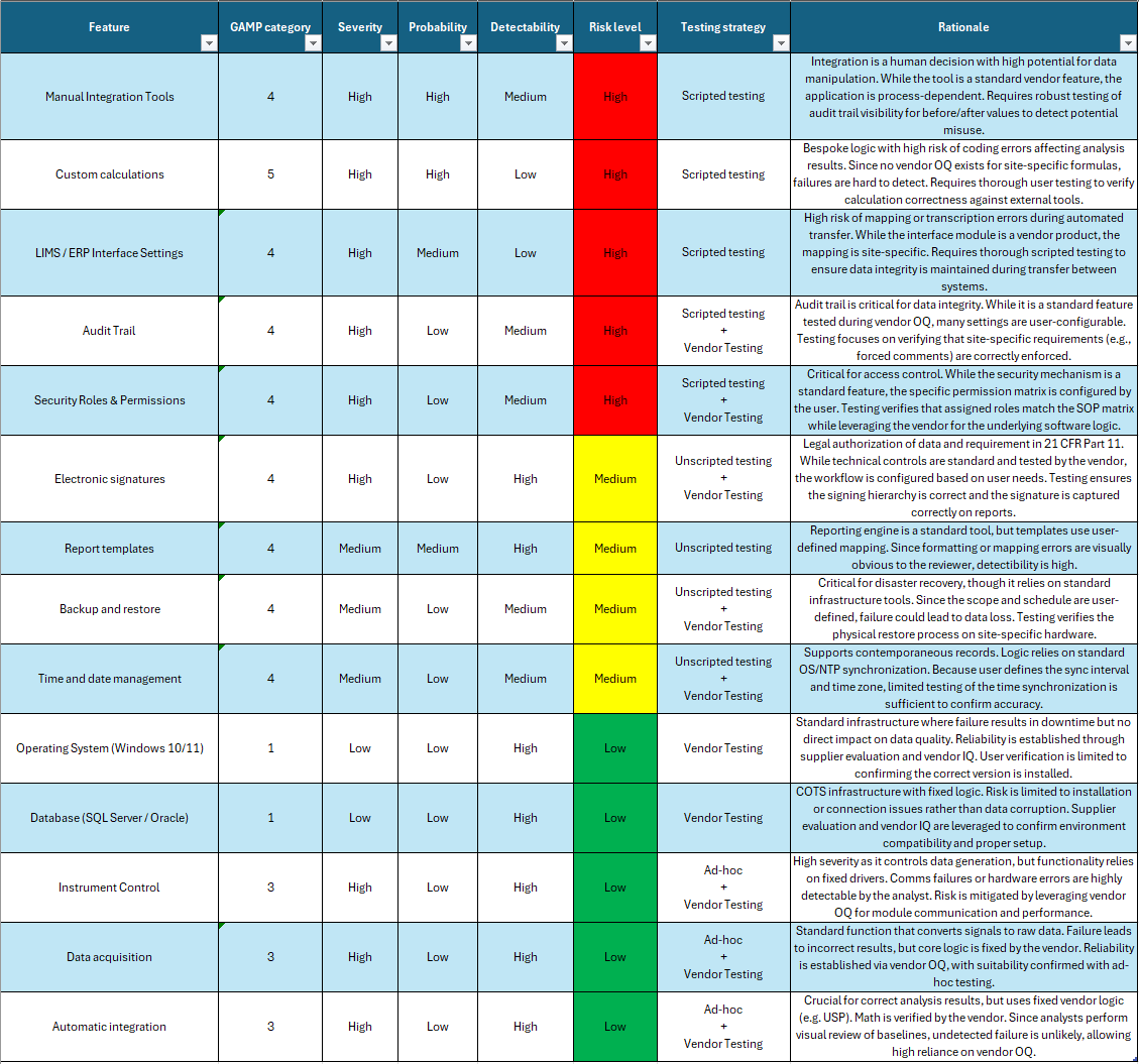 Keep in mind that the results of a risk assessment depend on the specific software and its intended use. The example above may not be suited to your particular quality system, and significant variations are possible. Always tailor your assessment to align with company policies and ensure your rationale is sound.