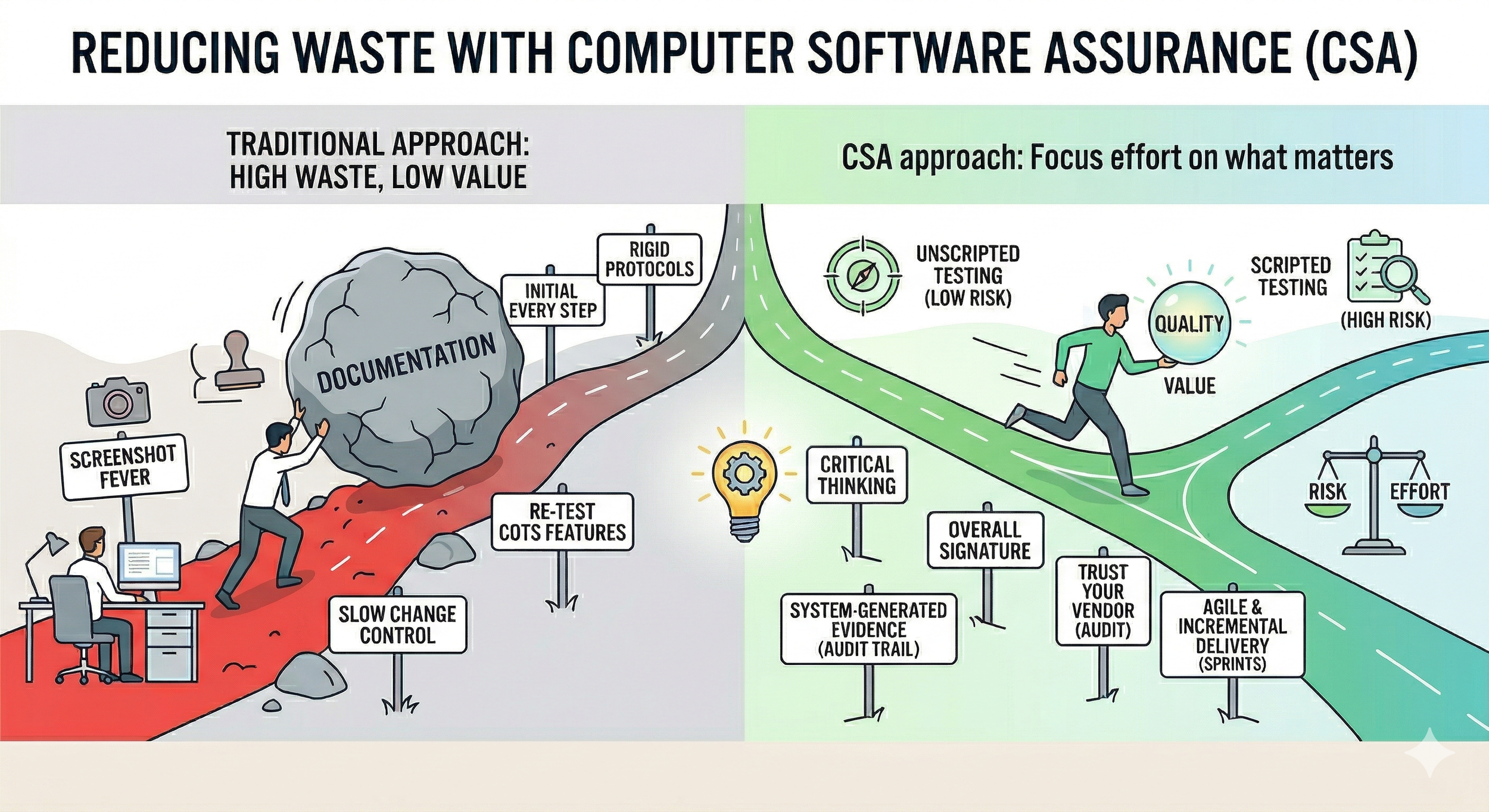 Fundamentally, the transition to CSA is a Lean initiative aimed at creating flow and reducing waste in the software validation process. Regulators agree that the primary goal is to minimize non-value-added activities by focusing on what truly matters. Below are the key strategies for reducing waste: