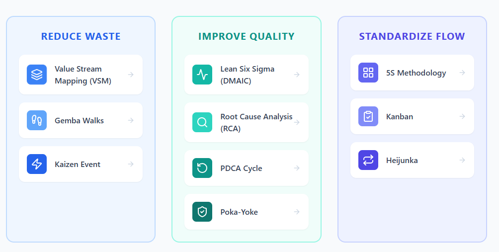 Lean Six Sigma (LSS): This methodology combines waste elimination with a data-driven approach to reduce process variation across five structured phases: Define, Measure, Analyze, Improve and Control (DMAIC). It is designed to solve complex problems by identifying and controlling unknown root causes.