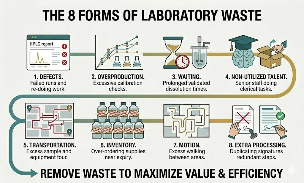 The elimination of waste is a core tenet of Lean. In a laboratory, waste typically falls into these eight categories: