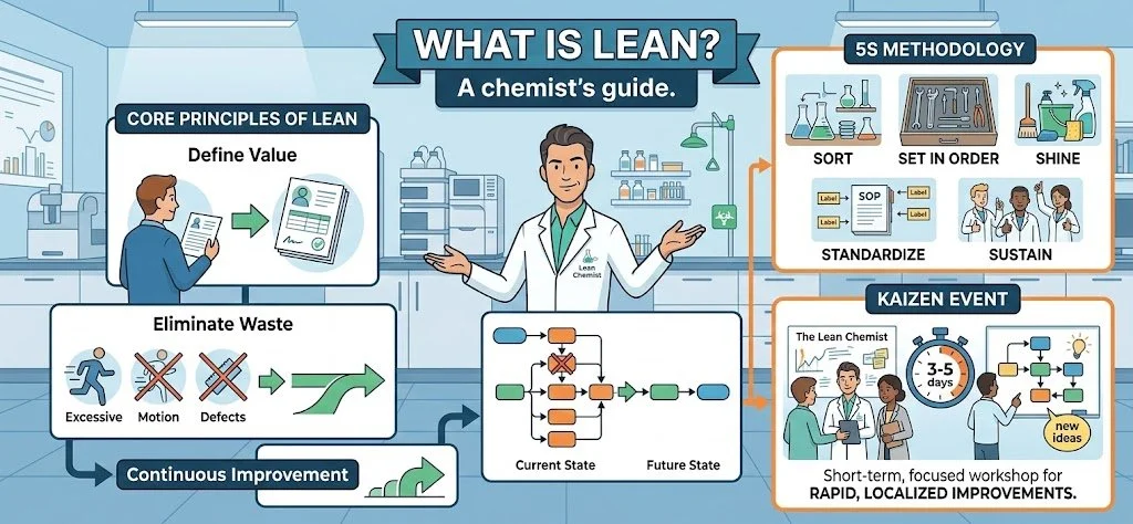 Are you an experienced chemist frustrated by how chaotic your day-to-day work in the laboratory is? Or perhaps you are a recent graduate who has just joined your first laboratory job in the industry setting and heard the terms Lean, 5S, or Kaizen but don't fully understand what they mean? You have come to the right place.